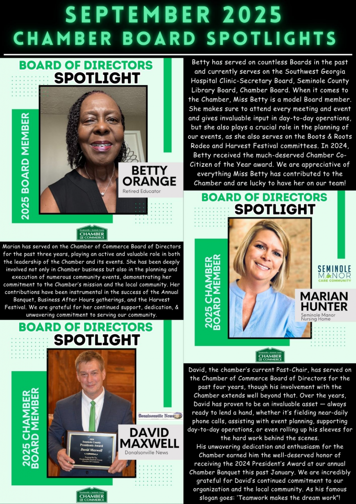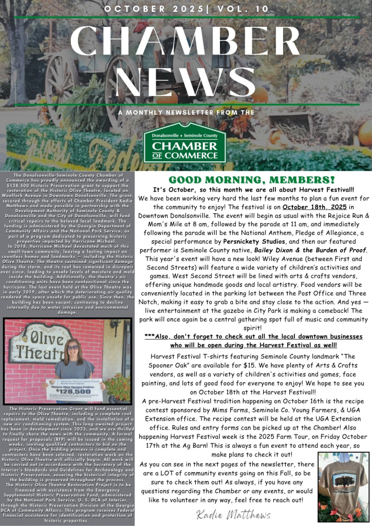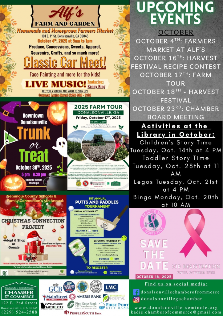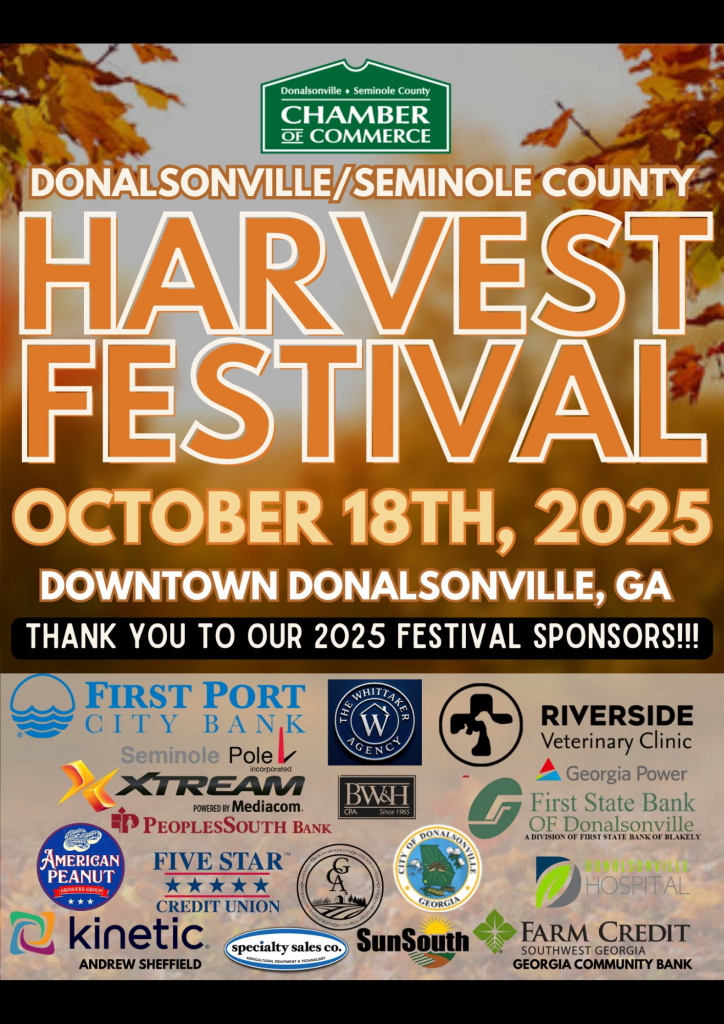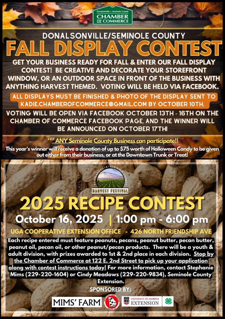 A pre-Harvest Festival tradition happening on October 16th is the recipe contest sponsored by Mims Farms, Seminole Co. Young Farmers, & UGA Extension office. The recipe contest will be held at the UGA Extension office. Rules and entry forms can be picked up at the Chamber! Also happening Harvest Festival week is the 2025 Farm Tour, on Friday October 17th at the Ag Barn! This is always a fun event to attend each year, so make plans to check it out!