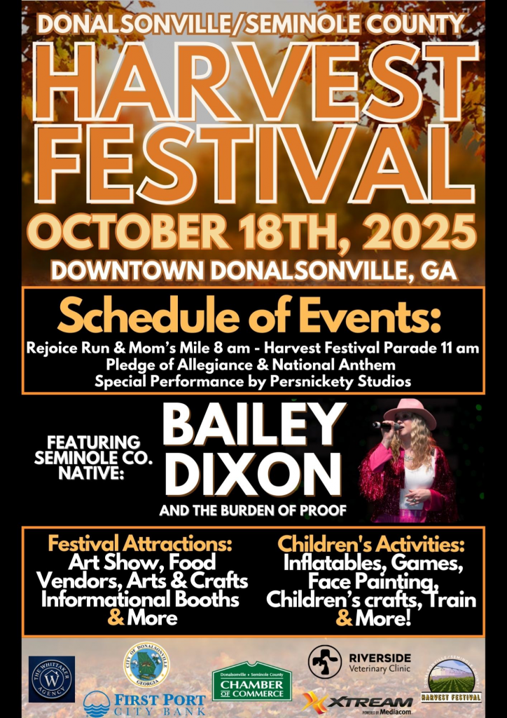 We have been working very hard the last few months to plan a fun event for the community to enjoy! The festival is on October 18th, 2025 in Downtown Donalsonville. The event will begin as usual with the Rejoice Run & Mom’s Mile at 8 am, followed by the parade at 11 am, and immediately following the parade will be the National Anthem, Pledge of Allegiance, a special performance by Persnickety Studios, and then our featured performer is Seminole County native, Bailey Dixon & the Burden of Proof.