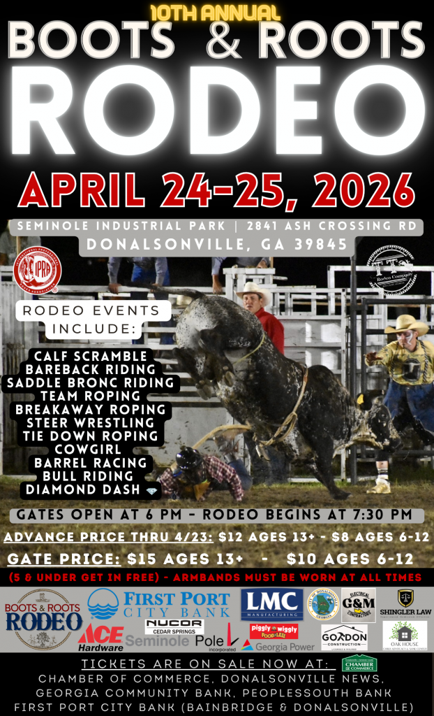 We are officially ONE month away from our biggest event of the year, the 2026 Boots & Roots Rodeo!!! Don’t forget to take advantage of advance ticket prices – Tickets are $8 in advance for ages 6-12, $12 for ages 13+, and 5 and under get in free. Tickets purchased at the gate will be $15 and $10! Tickets can be purchased at the Chamber of Commerce, Donalsonville News, PeoplesSouth Bank, Georgia Community Bank, and First Port City Bank! #BootsandRootsRodeo
