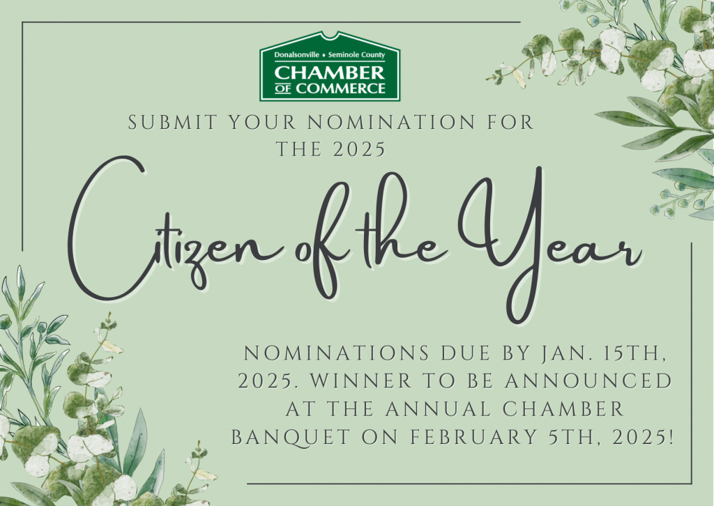 The Donalsonville-Seminole County Chamber of Commerce invites citizens and organizations of Seminole County to nominate that person for the 2025 Citizen of the Year award. The deadline for nominations is Thursday, January 15 at 5 p.m., and the recipient will be announced at the Chamber’s Annual Meeting and Banquet to be held February 5th from 6 to 8 p.m.